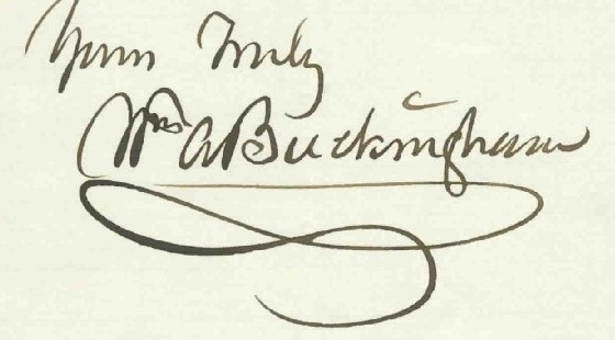 There is some mounting residue on the back of the stationary at the corners which shows through on the front. Governor Buckingham was obviously schooled in calligraphy and has a nice neat big signature which is very consistent, as shown in an enlarged view below.