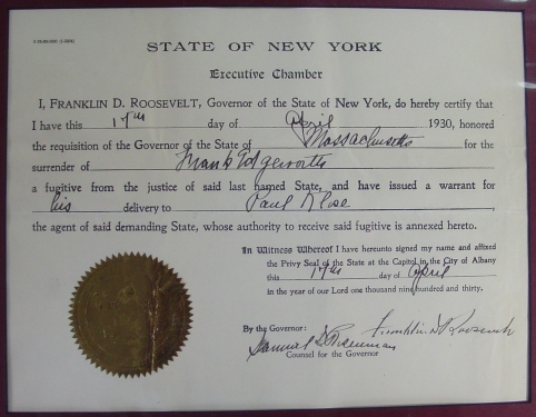 This is a Franklin D. Roosevelt signed official document of the State of New York releasing prisoner Frank Edgeworth "a fugitive from justice" to the custody of a Massachusetts Marshal on requisition of the Massachusetts Governor. This is what is called an extradition paper and it has both the official gold seal of the State of New York and is signed by the Governor's legal counsel, Samuel Rosenman, who went on to work for both FDR and President Truman and became the first White House Legal Counsel. Along with the extradition paper signed by FDR as Governor of New York.