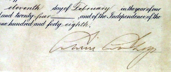 This document signed by Calvin Coolidge on February 11, 1924 appoints William A. Hilton to the job of Postmaster of Skaneateles, in the County of Onondaga in the State of New York. It's got some age discoloration but it has the official seal in the left bottom corner and good signatures by President Coolidge and Postmaster General Harry S. New (who served from February 27, 1923 through March 5, 1929). Price: $225/SOLD