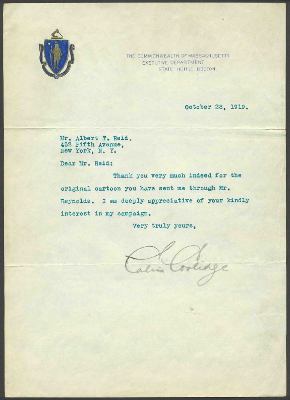 Calvin Coolidge wrote and signed this letter during his 1919 campaign for reelection as Governor of Massachusetts and shortly after the incident that made him famous nationally, the Boston Police Strike. Had it not been for his decisive actions in the Boston police strike and famous telegram to Samuel Gompers, nationally prominent cartoonist Albert Reid would have taken no notice of him and Coolidge the following year would not have been drafted as the Republican candidate for Vice President.