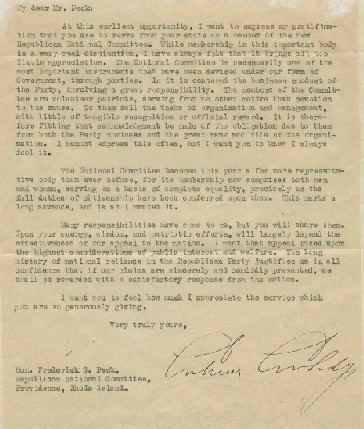 Coolidge's signature on letter with portion of Presidential Seal watermark visible