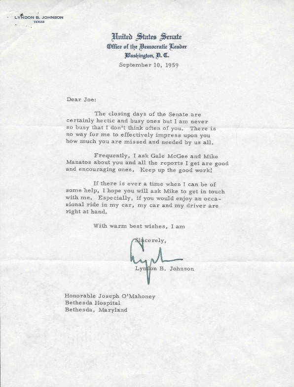 This letter and signature bear all the indicia of authenticity of a rare Lyndon Johnson personally signed letter! It is written to a fellow United States Senator, Joseph O'Mahoney of Wyoming, and member of Johnson's Democratic Caucus and thus someone more important to Johnson's power than anyone outside the Senate. It is written to a friend who is sick, a member who had served in the Senate since 1934 with only a two year interruption, and Johnson signs it with the personal "Lyndon" rather than his formal full name. This one's a keeper. The letter mentions Gale McGee and Mike Manatos as persons that Johnson checked with about O'Mahoney's medical condition during the legislative session and specifically asked O'Mahoney to to contact Manatos if he needs anything. Mike N. Manatos was probably on O'Mahoney's staff and went on to become Special Assistant to President John F. Kennedy serving under Lawrence F. O'Brien in the congressional liaison office. Gale W. McGee was a former staff member of Senator O'Mahoney who was in his first year in the United States Senate representing Wyoming at the time of our letter. The letter is clean and bright, with a nice authentic personal signature and shows the little personal touches that are important to securing and maintaining political power, of which Lyndon Johnson was a master. Price: $375/SOLD