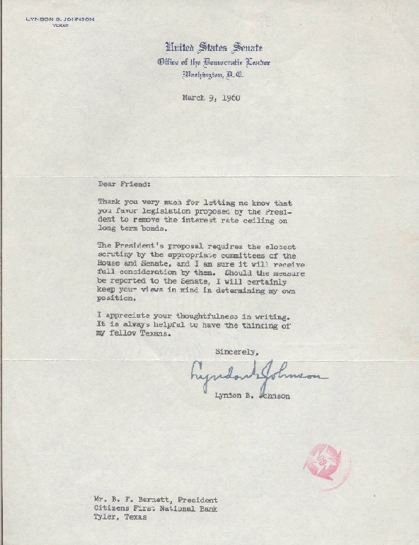 This Lyndon Johnson legislative business letter is to B. F. Barnett, President of the Citizens First National Bank of Tyler, Texas is in reply to Barnett's support for lifting the interest rate cap on long term government bonds, a subject which would naturally attract the interest of a banker. Johnson gives a non-committal response to the banker's request, probably because anything that Republican President Dwight D. Eisenhower and a banker could support would be perceived by a Democrat as hurting the interests of their constituents, in this case those purchasing government bonds. Johnson at the time was running for President of the United States and would later get 408 votes for President at the Democratic National Convention. But that was not enough and he chose to join the team led by John F. Kennedy as the Vice Presidential nominee of the party.
