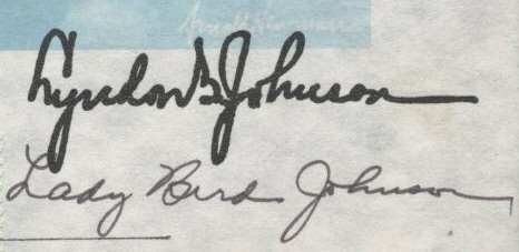 This document is entitled "Address by President Lyndon B. Johnson At The Dedication of the World's Fair April 22, 1964." The body of the document is President Johnson's speech with a portrait of the President. At the bottom it has a postal stamp for the New York World's Fair and a postal cancellation dated April 22, 1964 and the signatures of Lyndon B. Johnson and Lady Bird Johnson. A close examination of the signature indicated that the President's signature is a facsimile preprinted with the document and the First Lady's signature is authentic. This is a nice item for Presidential or First Lady collectors as well as world's fair and stamp collectors. Price $55/SOLD