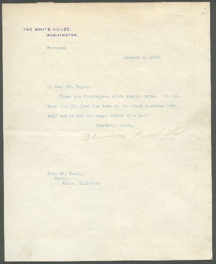 This is one of Theodore Roosevelt's humorous and exuberant letters which has the added benefit of being on White House stationary with a White House envelope and mentioning a father and son that had important roles in history.  The Mayor of Alton, Illinois, Edmund Beall, had sent President Roosevelt some stork puzzle cards and in this letter President Roosevelt thanks him for them and references Mr. Loeb, who was also in the "stork business" by being the recent father of a baby boy.
