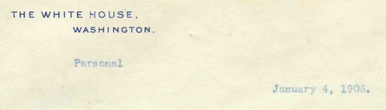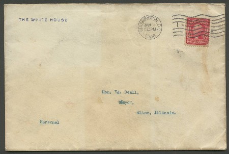 Also included is "The White House" envelope shown above postmarked Washington, D.C., JAN 4, 2:30PM, 1906 which is enclosed in a plastic sleeve on the back of the framed autograph.