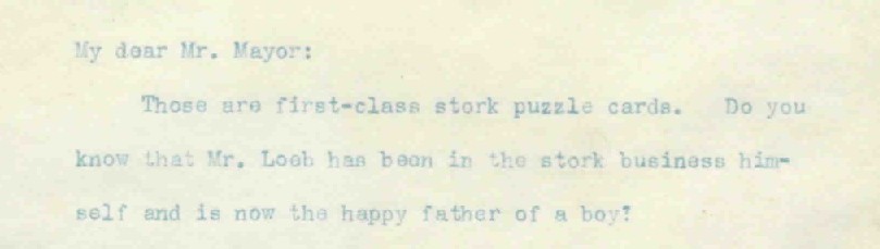 "Those are first-class stork puzzle cards. Do you know that Mr. Loeb has been in the stork business himself and is now the happy father of a boy!"