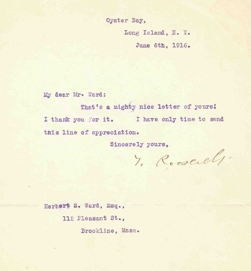 1916 Theodore Roosevelt Oyster Bay Letter "That's a mighty nice letter of yours!" Letter to fellow African Adventurer and Allied War Supporter Herbert Ward