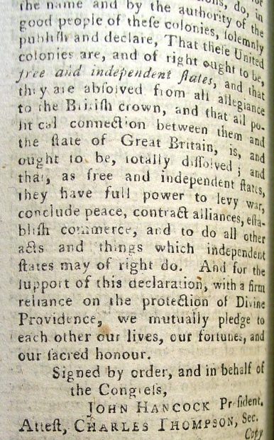 patterned it. Below is the start and end of the text of the Declaration of Independence published in August 1776