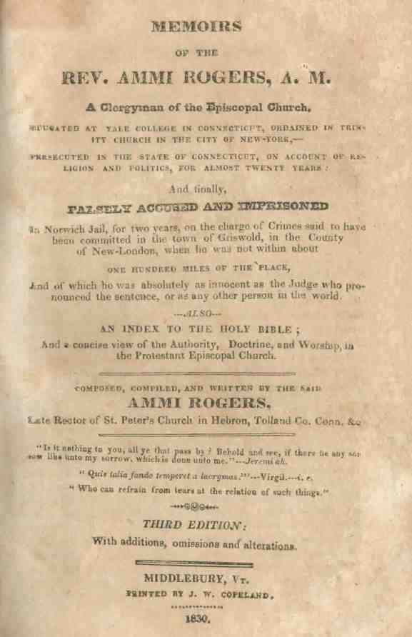 Memoirs of the Rev. Ammi Rogers...of the Episcopal Church...Persecuted in the State of Connecticut, on Account of Religion and Politics, for Almost 20 Years, And finally Falsely Accused and Imprisoned in Norwich Jail, for 2 years...Also, An Index to the Holy Bible; And a concise view of the Authority, Doctrine, and Worship, in the Protestant Episcopal Church 3d ed. Middlebury, VT, Copeland, 1830, 268pp, marbled paper on boards. w/leather spine, index.