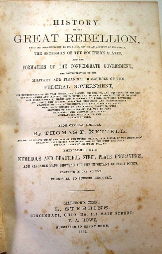 Published in Hartford, Connecticut in 1865 by L. Stebbins, the year the war ended. Spine with gilt lettering and blind-tooled fillets, cover with blind-tooled borders. 4to Illustrated with a tissue-guarded steel-engraved portrait of Abraham Lincoln, 39 tissue-guarded steel-engraved plates and 13 maps showing all the important military points. 778 pages. Most of the pages with tissue guards for the steel engraving are foxed, including the title page which is opposite the Lincoln frontpiece engraving, but the text is not, as shown below is largely devoid of foxing.