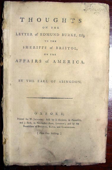 Price: $225 Pay securely with credit card through PayPal by clicking the button below First Edition of The Earl of Abingdon's Pamphlet on Affairs of America