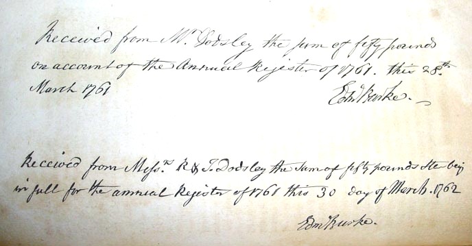 Above is text explaining Burke role in the creation, writing and editing of the Annual Register, which nowhere bears his name, and below are copies of Burke's signed receipts for payment proving his role in the important historic journals. There is label inside the front cover that says "EX LIBRIS JACOBI EMOT, BIBILOTHECAE REDWOODIANAE" with a printed date indicating is was accepted in June 1886 and a illegible signature above the label. There are stamps on the frontpiece and title page shown above the indicate the library was incorporated in 1747. There is also a library label on the spine with numbering above the title label which reads "LIFE OF BURKE." The cover shows wear on the edges and corners and there is an old repaired crack between the spine and the boards. Everything is holding together quite nicely, especially given the age and the retention of the original spine and boards. Price: $175/SOLD |