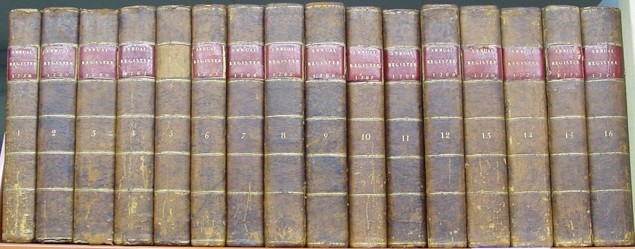 1758 through 1773 full leather set of Annual Registers This is a nice full leather set that covers the period from the start of the publication of the Annual Register in 1758 during the French and Indian War and concludes on the eve of the American Revolution. It covers the entire period when Edmund Burke was its editor and wrote most of articles and book reviews. The battle of conservative versus liberal and revolutionary are first seen in Burke's commentaries on the works of Jean-Jacques Rousseau and the conflicts over rights that would become the American Revolution are played out for the first time with regard to British imposition of stamp and tea taxes on the American colonies. It includes the 1772 volume with the early publication of the poem by the American female slave poet Phyllis Wheatley. The contents are more fully set out in the descriptions of individual volumes. Below are more pictures of the condition of this attractive set of books. The bindings and the text blocks are all tight and there is usual wear to the corners and extremities. There are no library stamps or any markings or writing that we could find. One of the title labels on the spine (for 1762) is missing but all volume numbers, from 1 to 16, are present. Price: $1,800 U. S. Shipping: $50 Pay securely with credit card through PayPal by clicking the button below |