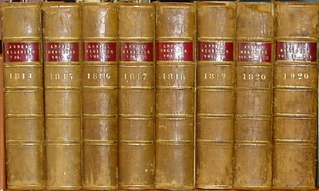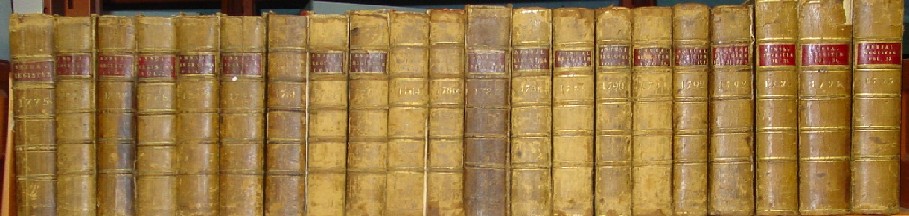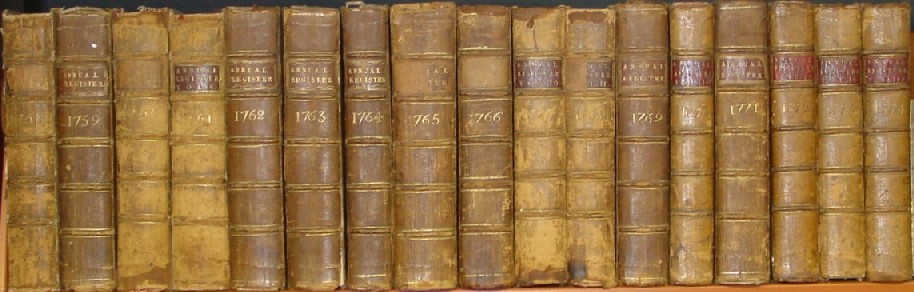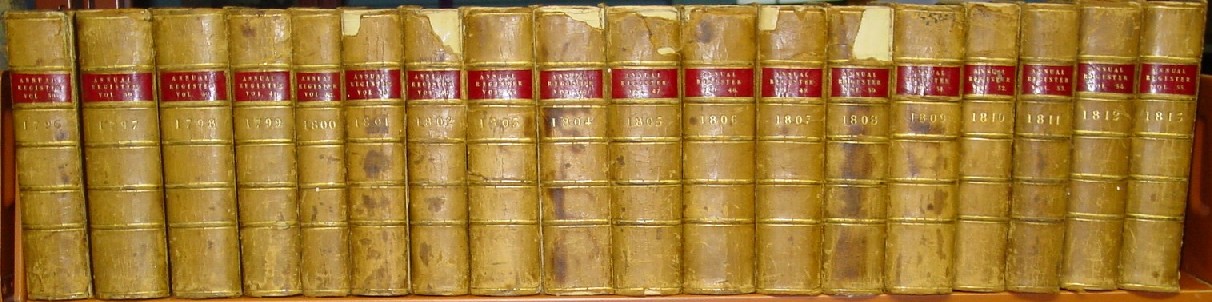 1758 through 1820 Annual Register Set Forty Two (42) of Sixty Four (64) Books First Editions Including 1775 through 1798! Offered here is a complete set of the 64 Annual Registers covering 63 years from 1758 through 1820 with a valuable 42 books (41 years) being first editions. And among the first editions is an unbroken run from 1775 though 1798 that covers the entire Revolutionary War and the founding of the American nation! Please see the descriptions of the individual years covered for more information on the contents of these volumes. The differences is numbers of books (64) and years covered (63) is because there are two books each (Part I and Part II) for the years 1792 and 1820 and the years 1784 and 1785 are covered in one book. The books are in a variety of conditions, most have labels, but some don't, as shown above, and a few have detached covers and one cover is missing. An inventory of editions with some condition comments is provided here. See also the pictures above. The forty two first editions alone are worth the price of this set, for they include the entire Revolutionary War and the 1776 and 1787 volumes which include the first publication in England of the Declaration of Independence, Articles of Confederation and the United States Constitution. Price: $2,800 U. S. Shipping: $85
