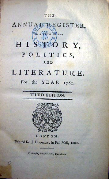This is a full leather first edition of the 1781 Annual Register in nice condition. There is some wear to the boards as shown and some cracks were the spine meets the boards, but the boards are firm and the text is very clean. There is an early ownership signature at the top of the title page (E. J. Stewart ?, as shown above) but no other markings Price: SOLD