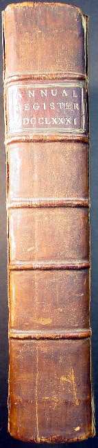Benedict Arnold was sent on another diversion to draw Washington's army and the militia of New England as well as to penalize the American privateers feasting on British shipping in Long Island Sound. Arnold's raid on New London and Groton and the Battle of Fort Griswold are recounted in this volume and a web site carries the 1781 Annual Register's account in full. In addition, a document which is signed by some of the brave Americans who defended Fort Griswold is available here. There is much more in this volume, including interesting letters concerning war matters from George Washington and John Adams that were captured by the British. Rather than recount them all the list we made of the items that struck our fancy when we read it are listed on a separate web page that can be reviewed by clicking here. Besides the single volumes available below, this volume is also available in a first edition in both the 1758 through 1791 and the 1778 though 1783 Revolutionary War leather set of Annual Registers. 1781 Fine Leather First Edition This is a first edition of the 1781 Annual Register in a fine full leather binding executed by Green Dragon Bindery. Price: $325 Pay securely with credit card through PayPal by clicking the button below 1781 Full Leather First Edition