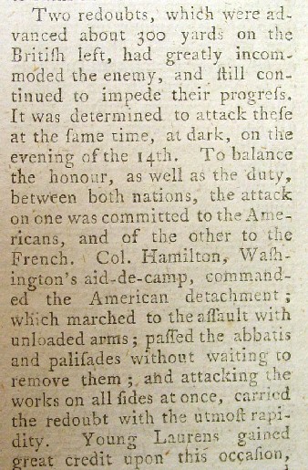 1781 Annual Register Historic Battles of Yorktown and Guildford Court House Benedict Arnold's British Reward for Treason and Capture, Trial and Hanging of Major Andre Benedict Arnold attack on New London and Groton, Connecticut Captured Letters of Washington and Adams and Full Revolutionary War News The Annual Register for the year 1781 covers important developments in the Revolutionary War which finally convinced the British public and Parliament that they could not "bring the American colonies to obedience." The most important battle of the war that convinced the British of that conclusion was the defeat of Lord Cornwallis at the Battle of Yorktown by the Continental Army under George Washington and the French Army under comte de Rochambeau. This volume provides extensive coverage of that battle and the events that led to that decisive battle (e.g., the Battle of Guildford Court House, Greensboro, North Carolina). It also covers the actions of the notorious traitor Benedict Arnold, who was rewarded with the rank of British Brigadier General, in his exploits in Virginia and his raid on New London and Groton, Connecticut. The capture, trial and hanging of Arnold's co-conspirator and spy, British Major Andre, are also covered in great detail. Captured letters from George Washington and John Adams concerning the progress of the war and its finances are also provided in full text in the State Papers section. The Battle of Yorktown warrants and gets full coverage, even some of the little details. For instance, the attack on the two redoubts, one of which was led by "Col. [Alexander] Hamilton, Washington's aid-de-camp" is described, as shown below left. The thought processes and actions of Lord Cornwallis that led to surrender are given a full account, including noting that "it would have been cruelty in the extreme to have sacrificed such gallant, and in every respect deserving troops, to a point of honour, which the improved state of civilization has wisely exploded..." Cornwallis wanted more favorable surrender terms, but British conduct in treating the surrendered American garrison in Charleston in 1780 resulted in the British getting no better terms than were previously accorded the Americans.