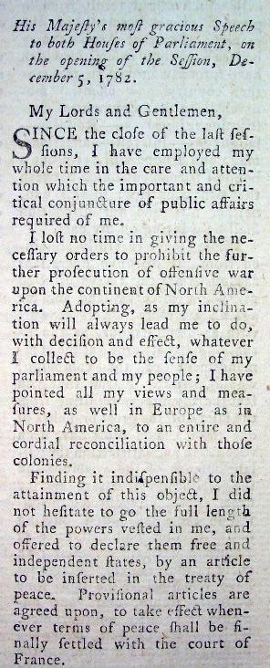 1783 Annual Register End of Revolutionary War - Peace Treaties and Recognition of American Independence George Washington Gives Up His Command of the Continental Army: Circular Address and Final Orders Emphasize Need For Stronger Federal Government The highlight of this volume is the acknowledgement by the King of England and the English Parliament that the former English colonies in America were free and independent states. In this volume that acknowledgement comes in a variety of forms, the full text of the speech of King George III in December 1782 in which he notes his offer "to declare them free and independent states," the full text of the September 1783 peace treaty between the United States and England signed by Benjamin Franklin and John Adams, and an extended history of the peace negotiations and significance of the treaty provisions. There are two more interesting historical items in this volume that flowed directly from those peace negotiations. The first was settling account with France, the biggest financial and military supporter of America during the war and the second was the resignation of George Washington as head of the Continental Army and his advice to his troops, Congress and Governors. Below are two excerpts from the speech of King George III to Parliament in December 1782 which for the first time acknowledged American independence and his self-serving wish that "America may be free from those calamities which have formerly proved in the mother country how essential monarchy is to the enjoyment of constitutional liberty." He was right that something more than the Articles of Confederation were needed, but it was not an monarchy, it was our own Constitution adopted in 1787.