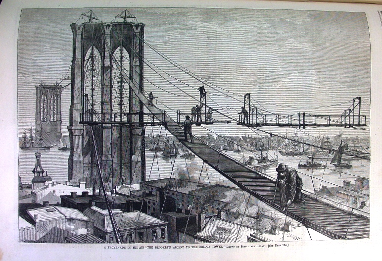 The Brooklyn Bridge was under construction in 1877 and this is a wonderful view of that construction.