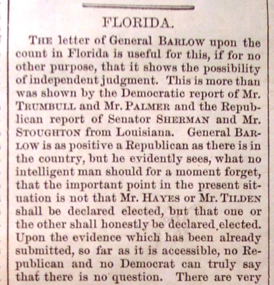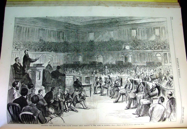 This historic volume of Harper's Weekly contains the first six months of weekly issues of 1877 which was a momentous year which started with tremendous strife and controversy over the election of 1876, the creation of an electoral commission to resolve the election and the inauguration of President Rutherford P. Hayes shortly after the matter was decided. This volume is in great condition. Very, very few 1877 volumes of these weekly magazines have survived in such good condition as this one, as shown by the pictures above and those which follow. These two articles appear on the first text page of this volume. They set out the difficult problem faced by the country with no rules to decide the election and the State of Florida the key to who would win much like the 2000 election. But unlike 2000, this was a much more serious controversy, with violence being threatened and the result not decided until just before inauguration day.