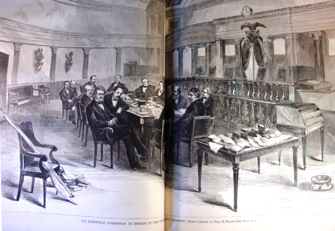 The means chosen to resolve the matter was an electoral commission chosen by the House and Senate. Their deliberations were closely followed and a key member that balanced the interests left in the middle of the deliberations to become a United States Senator. Below is a engraving of the Electoral Commission.