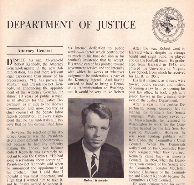 One of the more controversial appointments of JFK as that of his brother Bobby as Attorney General. The Digest explains his qualifications.