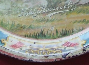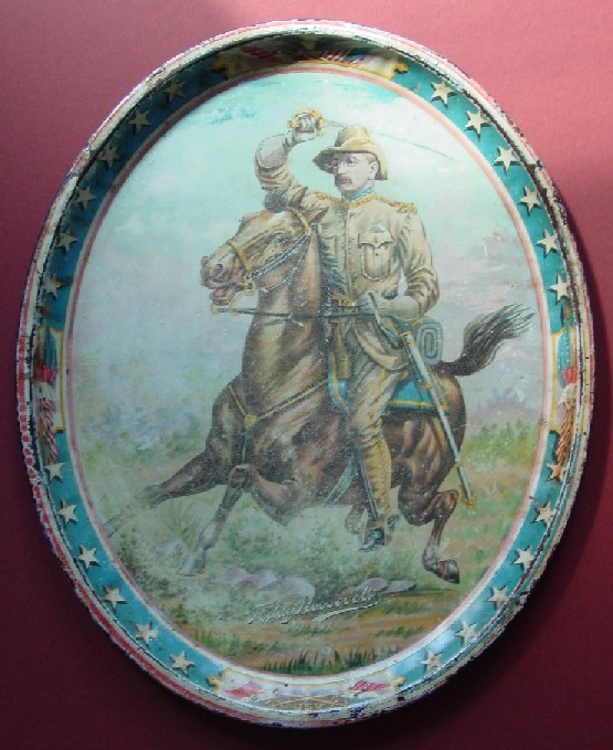 This is a dramatic color lithographed tin tray measuring 14 x 16" that has Theodore Roosevelt in his custom designed Brooks Brothers army uniform riding a galloping horse with his arm raised with a sword, ready for battle. Roosevelt rose to national fame after his heroic efforts in the Spanish American War in the seizure of San Juan Hill. The unit he raised and served with was known as the Rough Riders and they were composed of a diverse group of blue blood Ivy League college graduates and rough hewn Westerners that Roosevelt knew from his Dakota days. His popularity after the war in 1898 led to his election as Governor of New York and from their both Vice President and President of the United States.