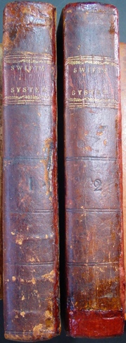 The First Legal Text Published In America! 1795-6 Treatise "The System of Laws of the State of Connecticut" Incorporates English Common Law Subscribers of Two Volumes Included President George Washington & Vice President John Adams Written by Congressman and Future Connecticut Supreme Court Chief Justice Zephaniah Swift Other Notable Subscribers James Madison, James Wilson, Oliver Ellsworth, Aaron Burr & Albert Gallatin "A System of the Laws of the State of Connecticut" by Swift, Zephaniah, Two Volumes, In Six Books. Windham: Printed by John Byrne for the Author, 1795-1796. Folding copperplate table of descents. Octavo (8-3/4" x 5"). Bound in original calf , original red and black morocco spine labels, hinges repaired, as shown below. Light browning and foxing in places. Early owner signatures, top of title pages cut off as shown below. "The first American law text. It displayed a thoughtful philosophy of government as well as a thorough presentation of the constitutional and working government of the state." Dictionary of American Biography IX:250. "The first essay of its kind in America." Sabin. Each volume contains three of the Six Books, as issued. The work is a comprehensive discussion of the powers and limits of government, the rights of persons, the nature of property, torts, crimes, and the principles of equity. The prestigious Subscriber List from 14 states includes President Washington, Vice President Adams, several Cabinet members and Supreme Court justices, Aaron Burr, James Kent, Alexander Dallas, Edward Livingston and other notables. FIRST EDITION. At the end of the 2nd volume is an extensive list of subscribers, including those listed below. Another owner signature of Samuel White dated 1821 is at the bottom of the page and other owner signatures of Roger Welles and E. O. Goodwin, appear on the front endpapers.