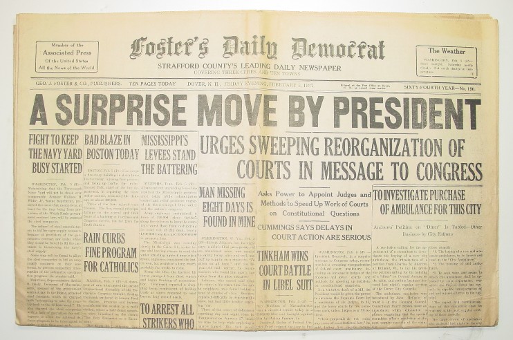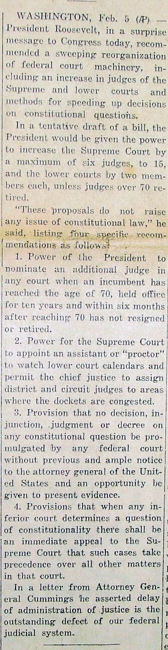 Offered here is a complete February 5, 1937 newspaper, Foster's Daily Democrat, which headlines Franklin D. Roosevelt's court-packing scheme to assure that the Supreme Court would approve all his New Deal legislation of questionable constitutionality which had previously been rejected. The newspaper article accepts President Roosevelt's spin that it was an effort to eliminate court delays rather than a blatant power grab. The front page article does, however, accurately summarize the plan, as shown below: