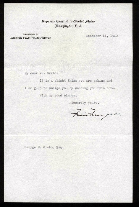 This is a clean letter in excellent condition with a strong signature from Frankfurter on his Supreme Court Chambers stationary shows how polite and accommodating he could be in an apparent response to an autograph request. Frankfurter in the year this letter was written authored one of his most controversial decisions of his Supreme Court tenure in Minersville School District vs. Gobitis upholding the right of a public school to dismiss a Jehovah's Witness for failure to salute the American Flag. Writing for an 8-1 majority, Frankfurter used this reasoning: