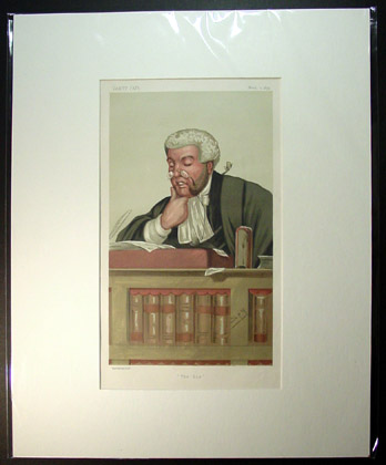 This original Vanity Fair print by Spy (Sir Leslie Ward) from 1879 is entitled "The Law" and pictures the first Jewish judge, Sir George Jessel, on the bench studying his legal papers. This print with full borders comes already matted with acid free mat board to a standard frame size (16 x 20") and the description of the Judge Jessel by Jehu Junior that was provided when the print was originally published in 1879. Below are description and how the print looks matted.
