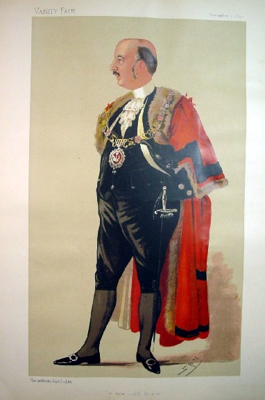 This is an original 1890 Vanity Fair lithograph by Sir Leslie Ward (signed as "Spy") of Joseph Savory, a goldsmith, sheriff and alderman who was about to become Lord Mayor of London, shown in a fancy suit of office of black and red with sword and medal of office. The print comes matted to a standard 16 x 20 inches frame size and encased in a protective plastic sleeve. It also includes the biography shown below by Jehu Junior which was included with the print when it was published in 1890.