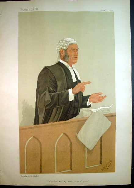 This original 1891 Vanity Fair print pictures barrister Mr. Alfred Cock, Q. C., arguing in court with the inscription on the bottom, "He has leathern lungs and a voice of brass." The ever frank Jehu Junior in his description says this of the talents and style of attorney Cock: