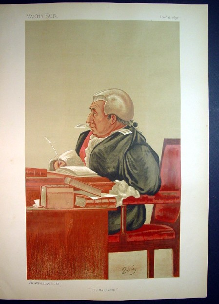 This original Vanity Fair print published on December 13, 1890 pictures Judge Roland Williams on the bench or at his desk surrounded by law books and writing with a quill pen. At the bottom of the print is the title "The Mandarin." In his biography of Judge Williams he explains the print moniker "Mandarin" by reference to his style as an advocate: