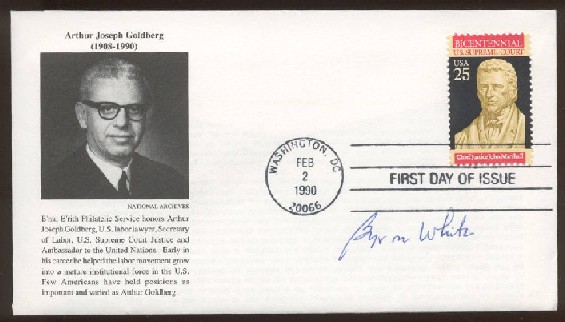 Justice Byron White Signed Envelope Honoring Justice Arthur Goldberg and The Bicentennial of The Supreme Court This is an envelope the honors former Supreme Court Justice Arthur Goldberg and the 200th Anniversary of the first session of the Supreme Court. The cancellation mark is dated February 2, 1990 with the words "FIRST DAY OF ISSUE" and the stamp pictures John Marshall and says "BICENTENNIAL U.S. SUPREME COURT" and below the portrait "Chief Justice John Marshall." On the left is a portrait of Arthur Joseph Goldberg (1908-1990) and a brief commemoration of his career by the B'nai B'rith Philatelic Service. It is signed by Supreme Court Justice Byron White who with Goldberg were the only two Supreme Court nominations of President John F. Kennedy. It is a very nice item in great condition for Supreme Court, Justice Goldberg or Justice White collectors. Price: $75 Pay securely with credit card through PayPal by clicking the button below