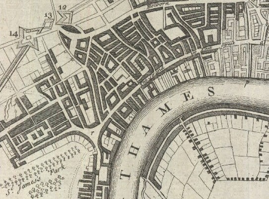 A plan of London, showing the defenses for the Civil War as well as the area destroyed by the Great Fire. The 23 defence forts, built to protect the city from attacks by Charles I and his 15,000 Royalist troops, were linked by eighteen miles of ramparts. Below is a close-up view of the Thames, St. James Park and central London with the numbering of forts 12-14.