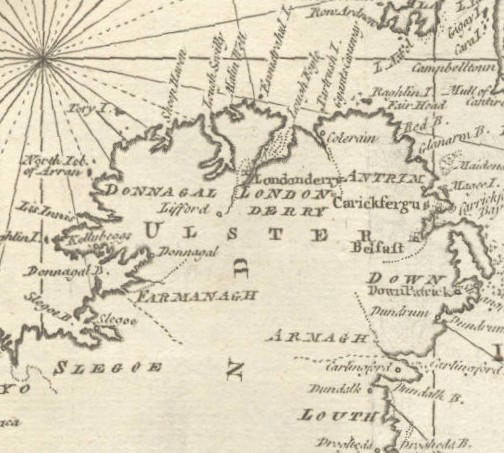 Below is a close-up of the map showing Northern Ireland, showing counties Slego, Donegal, Londonderry, Antrim, Armagh, Louth and Down with the city of Belfast.