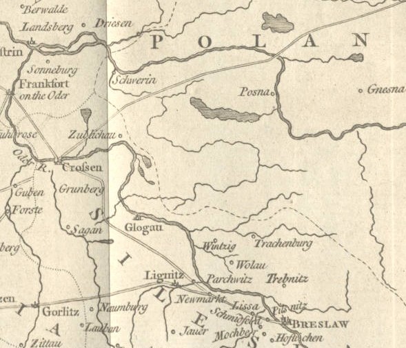 The close-up below pictures the portion of the map which is mostly of Poland, including the cities of Breslaw (Breslau or Wroclaw), Trebnitz (Trzebnica) and Gnesna (Gniezno).