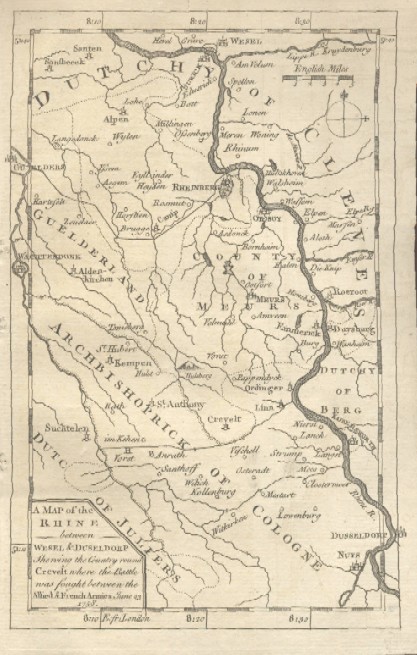 "A Map of the Rhine between Wesel & Duseldorp Shewing the Country round Crevelt Where the Battle Was Fought between the Allied & French Armies June 23, 1758"