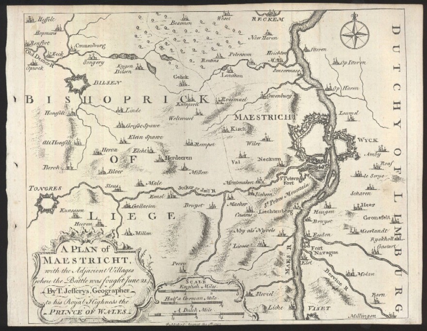 A Plan of Maestricht, with the Adjacent Villages, where the Battle was Fought June 21. By T. Jefferys, Geographer to His Royal Highness the Prince of Wales