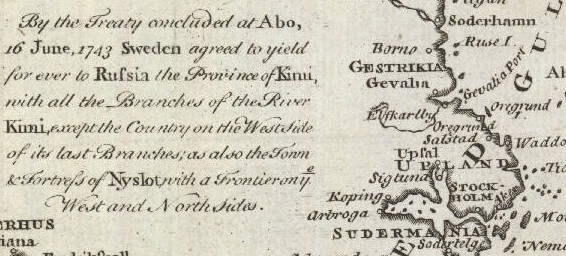 Below is a close-up of the map showing the area around Stockholm with a text explaining the ceding of Swedish territory to Russia.