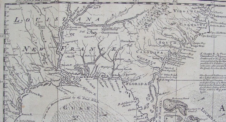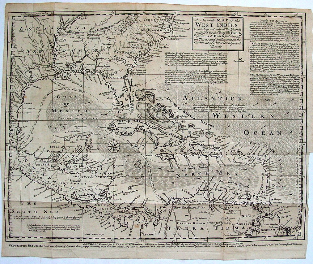 "An Accurate Map of the West Indies. Exhibiting Not Only All the Islands Possess'd by the English, French, Spaniards & Dutch, but also All the Towns and Settlements on the Continent of America Adjacent thereto" Below is the portion of the map the covers the current United States.