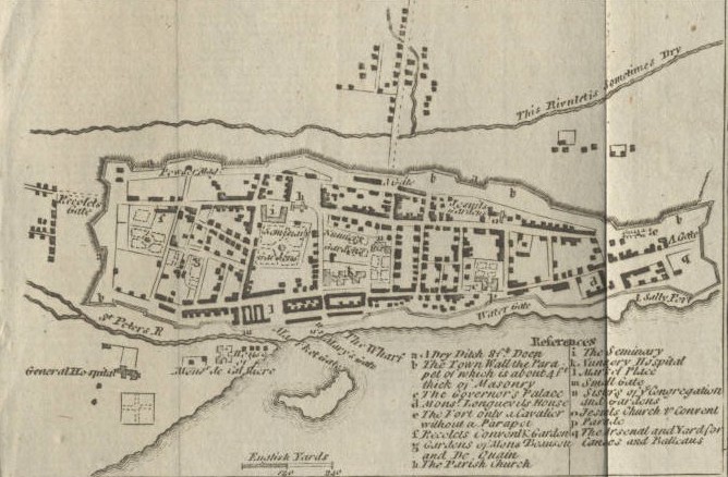 This map is three maps in one, with an overview of the Northeast theatre of war in 1760, largely from Lake Erie to Montreal, a view of the Montreal vicinity in the bottom right and a street level view of Montreal at the top right which is shown above. Date: 1760 Price: $175/SOLD Pay securely with credit card through PayPal by clicking the button below