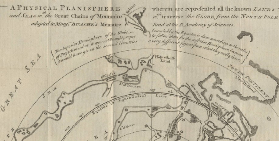 "A Physical Planisphere wherein are Represented All the Known Lands and Seas wth. the Great Chains of Mountains wch. Traverse the Globe from the North Pole. Adapted to Monsr: Buache's Memoire Read at the R. Academy of Sciences"