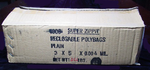 We were at an auction which was selling surplus state items and since we use this size plastic bag frequently we bought a large lot of these sturdy reclosable bags (sometime called zip lock), more than we need. The last time we checked the prices of similar boxes of 1000 4ml, 3 x 5 reclosable bags Staples sold them for $40.94 with shipping and Uline sells them for $41.50 with shipping. We charge $25, which includes shipping in the continental United States. Box of 1000 bags Price: $25 Pay securely with credit card through PayPal by clicking the button below