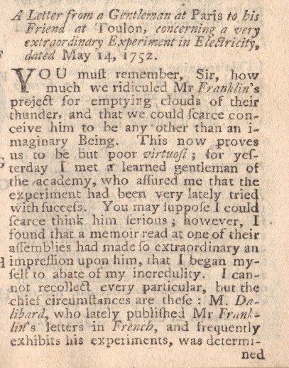 French King Witnesses Electricity Experiment Conducted by His Physician Based on Ben Franklin's Work "by pointed bars tempestuous clouds may be cleared of their fire.” French Scientist Unbeliever Now Convinced by Franklin's Hypothesis; British Royal Society Convinced by Franklin's Proof Collinson Notes Lighting Hitting French Church Cross Consistent with Franklin Hypothesis The highlight of this June 1752 issue of Gentleman's Magazine are three letters/articles on Ben Franklin’s lightning rod hypothesis and it confirmation by French experiments; 1) Peter Collinson, Ben Franklin's regular correspondent and Fellow of the Royal Society comments upon cross on top of French cathedral, hit by lightning and the natives observations about safety from lighting 2) a Letter from a Gentleman in Paris conceding he was wrong about Franklin’s conclusions and 3) a report of electrical experiment performed by the King’s physician for French King which states that,