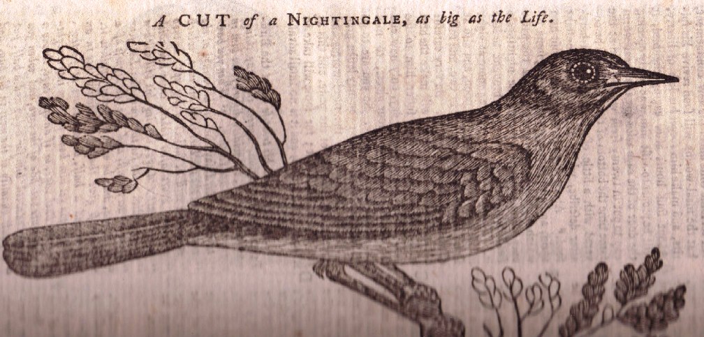 Below is the index showing the other articles in this issue. The only engravings are of the Nightingale shown below and cages and devices for catching Nightingales. The issue is textually complete and in fine condition.