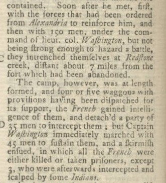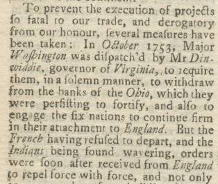 Colonel George Washington's First Military Victory at Jumonville Glen Reports on "American Contests" That Led to French and Indian War Washington's First Expedition and Military Engagement Described This great issue of Gentleman's Magazine published in July, 1754 records the first two major accomplishments of the Father of our Country, his expedition into the wilderness to convince the French to abandon Fort Duquesne and his subsequent military battle with a French detachment which resulted in his first military victory. In the article entitled "American Contests Stated" George Washington's military rank is described a "Major" and then "Captain" but he was a colonel in the Virginia militia. These events directly led to the French and Indian War which started in the following year. Below on the left is an except which describes Washington's assignment by Governor Dinwiddie to the expedition to the French fort to "require them, in a solemn manner, to withdraw from the banks of the Ohio, which they were persisting to fortify." A more extensive account of the major expedition is provided in the previous month's issue of Gentleman's Magazine. The excerpt on the right below describes the military battle/skirmish at Jumonville Glen. That battle in turn led the French to descend in force on Washington in the Great Meadow and led to Washington's capitulation at Fort Necessity, which is described at length in another issue we are offering.
