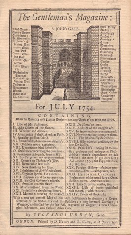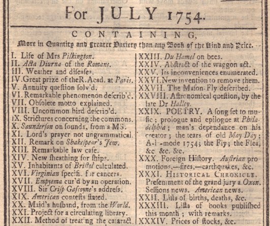 The contents below show the reference to the Washington article as "American contests stated." There is much other interesting news and articles, form "Shakespeare's Jew," to an article on bees, astronomical questions directed to Dr. Halley (of Halley's Comet fame) and new books and poems. The July 1754 magazine is disbound and in very readable condition as shown in these pictures. There is a split at the spine but it does not distract from reading and enjoyment.